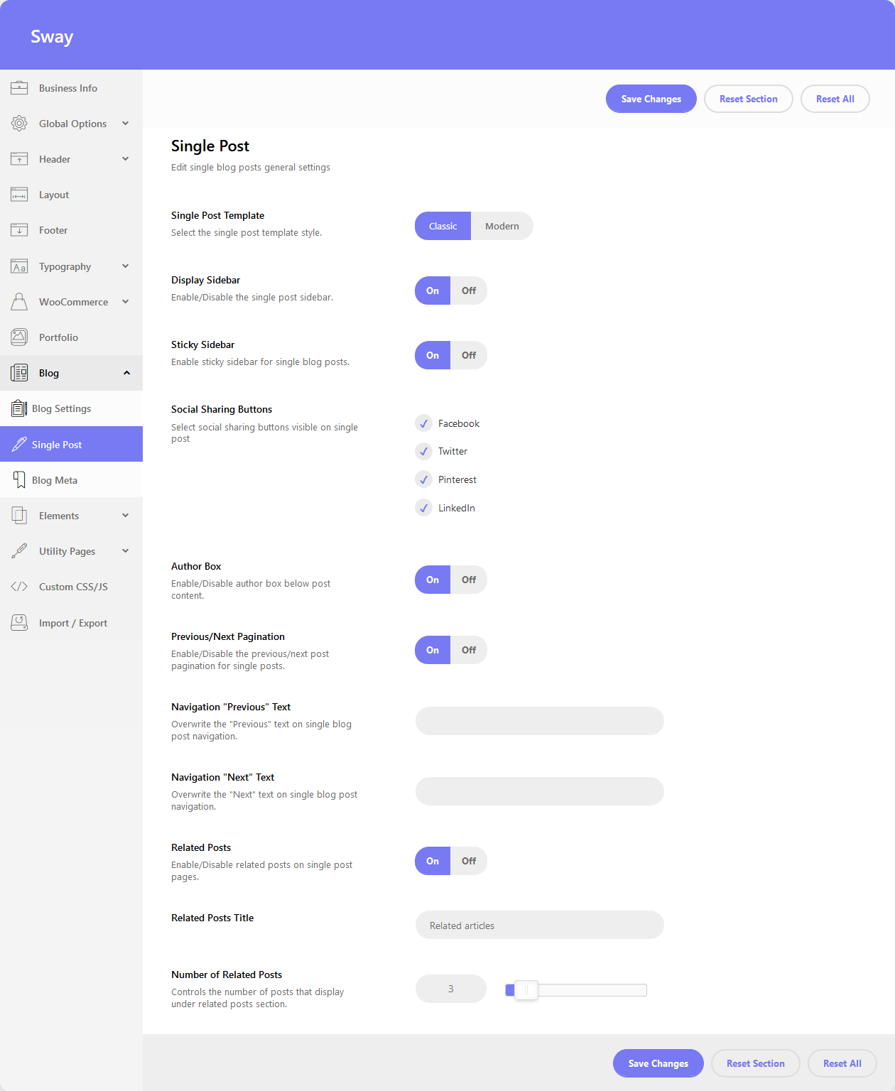 These settings allow you to tweak the Single Posts for your site. Here you can select the style in which you want your blog articles to display, also some features that can be enabled/disabled from here.